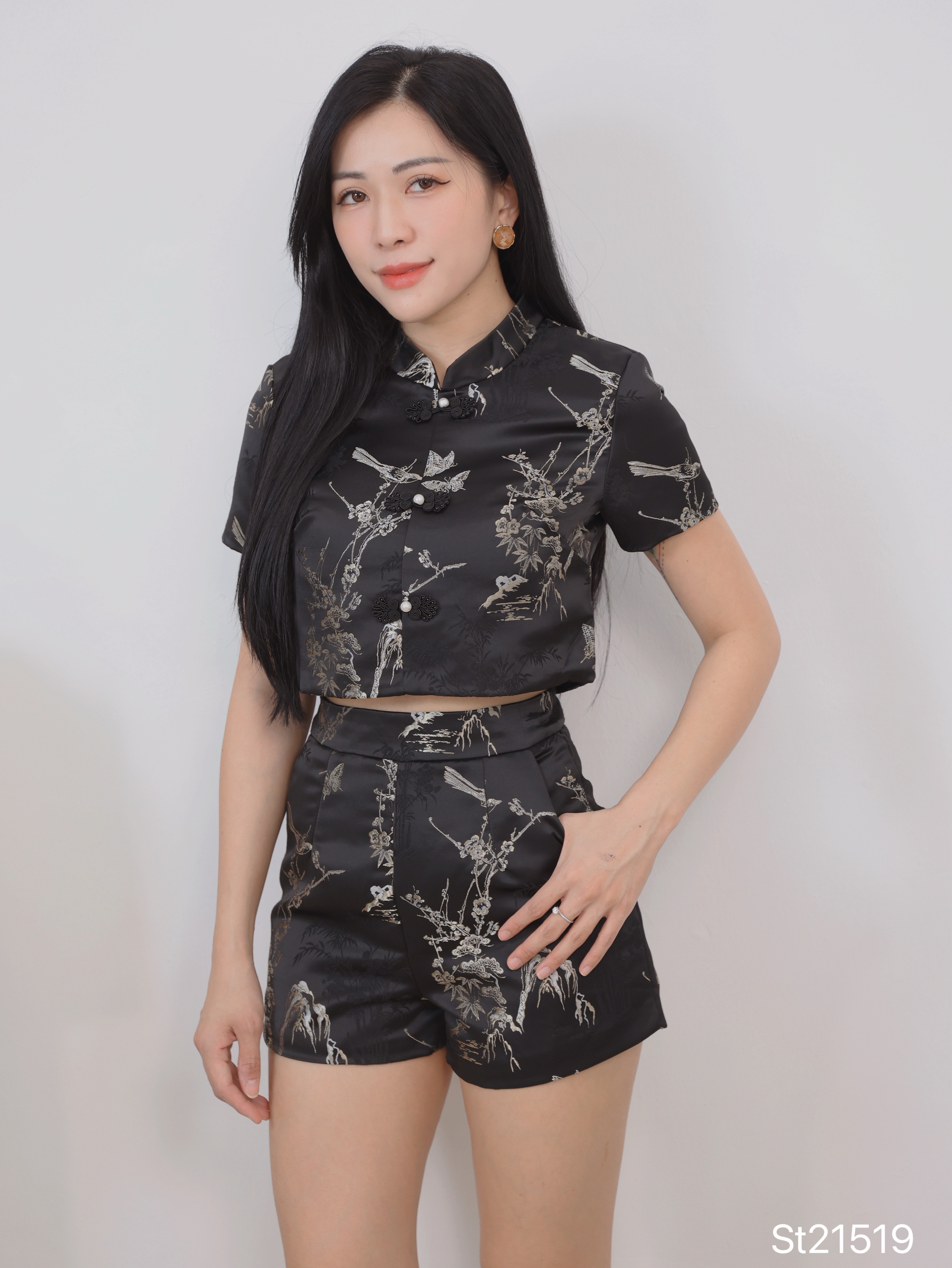 洋气盘扣设计圆领上衣 + A字阔腿高腰短裤 (背面隐形拉链 / 侧边双口袋)