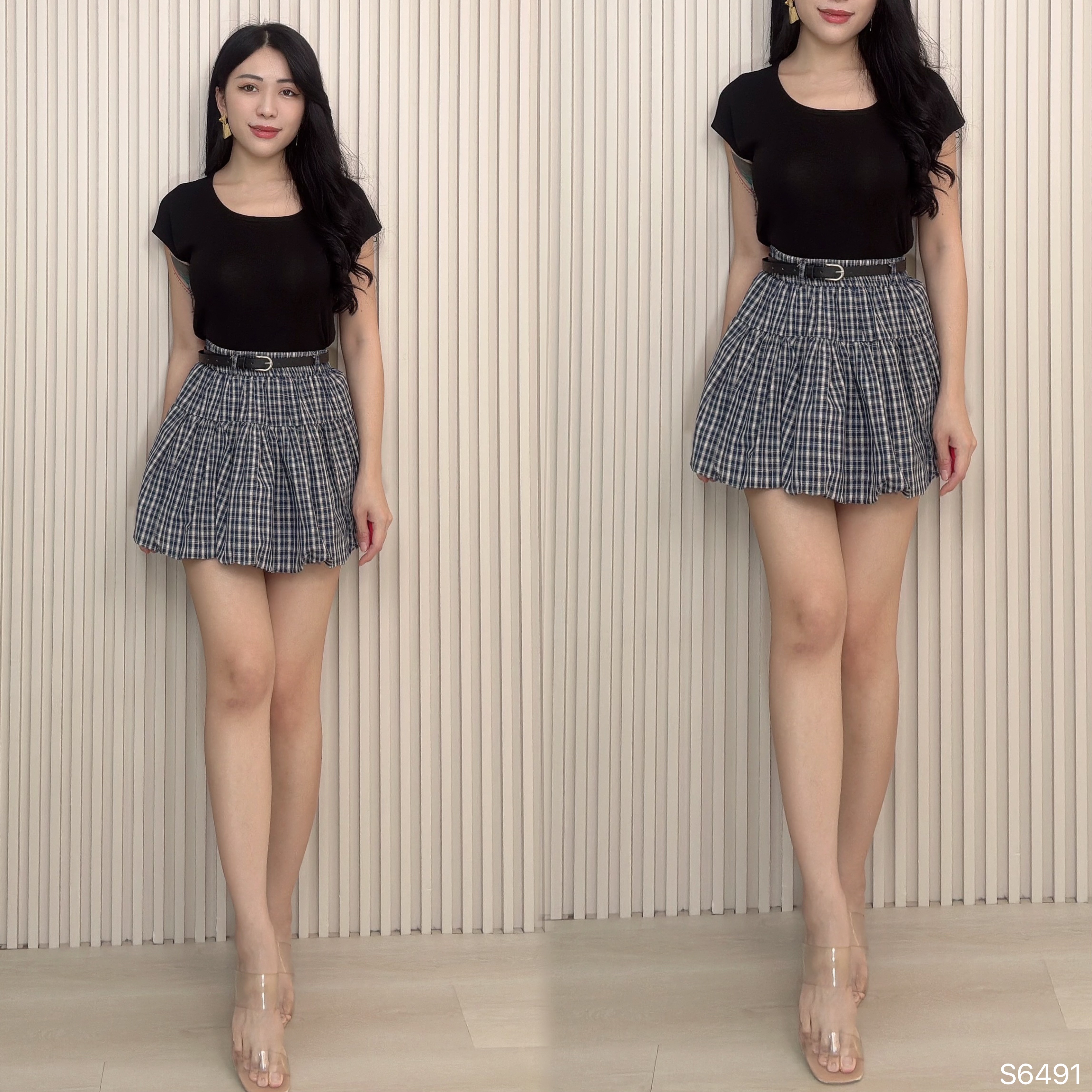 复古格子花苞设计高腰裤裙 (S6491)