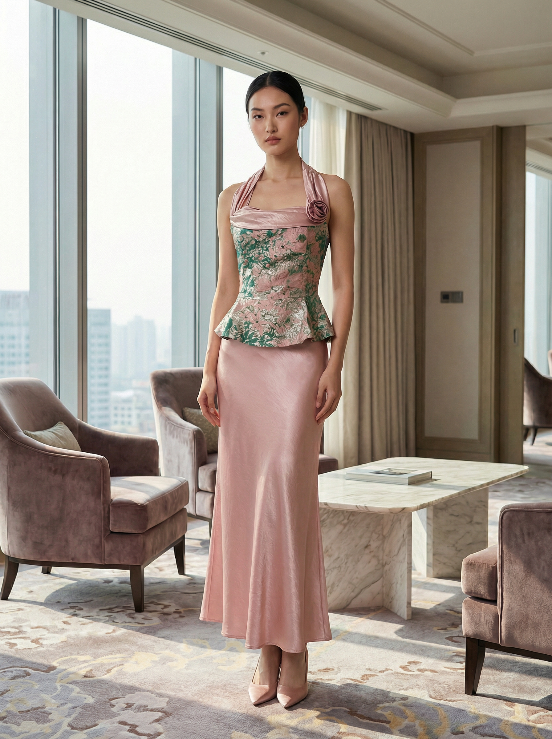 挂脖围巾领抹胸上衣 + A字高腰半身裙 ![❤]()
