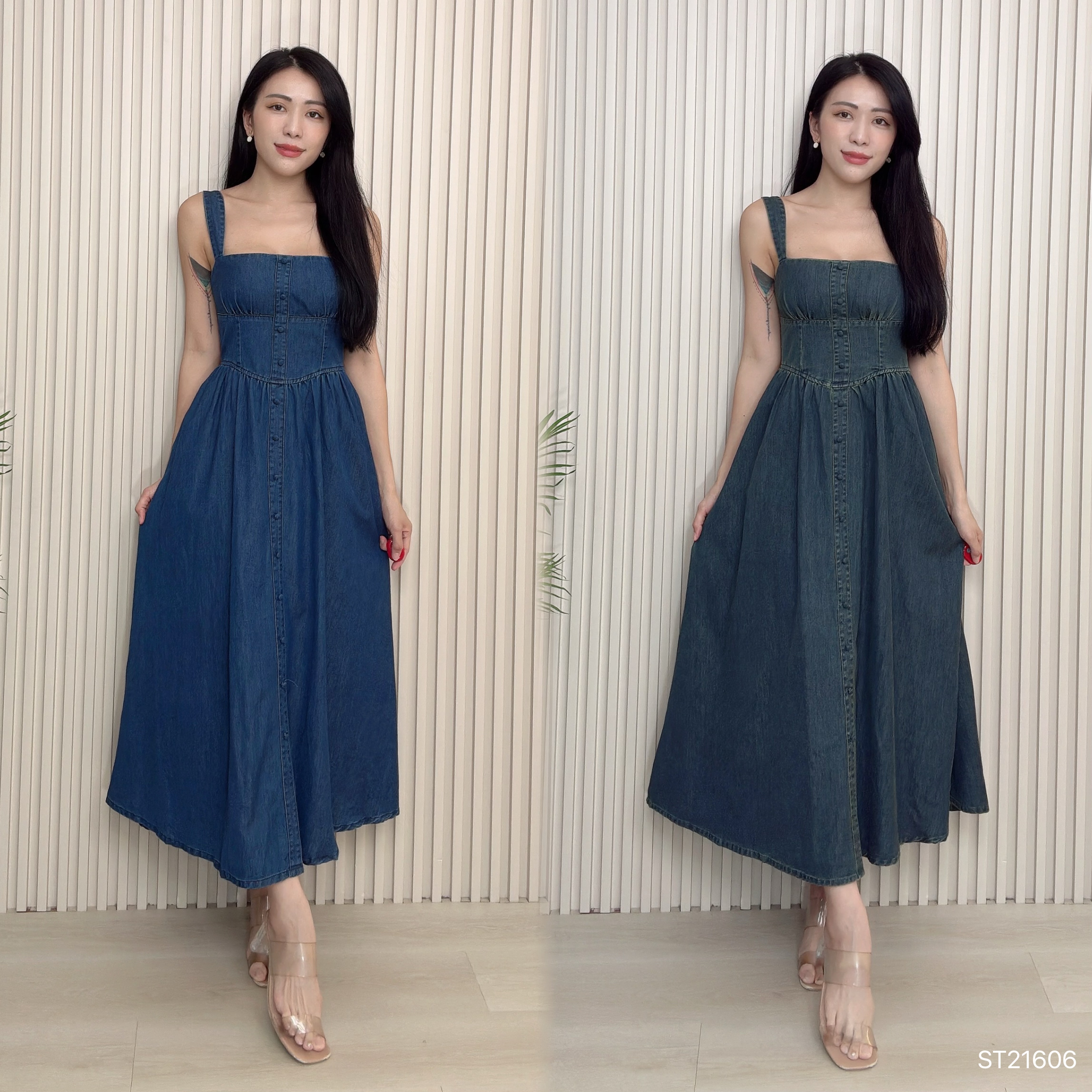 韩系排扣束腰吊带连身裙