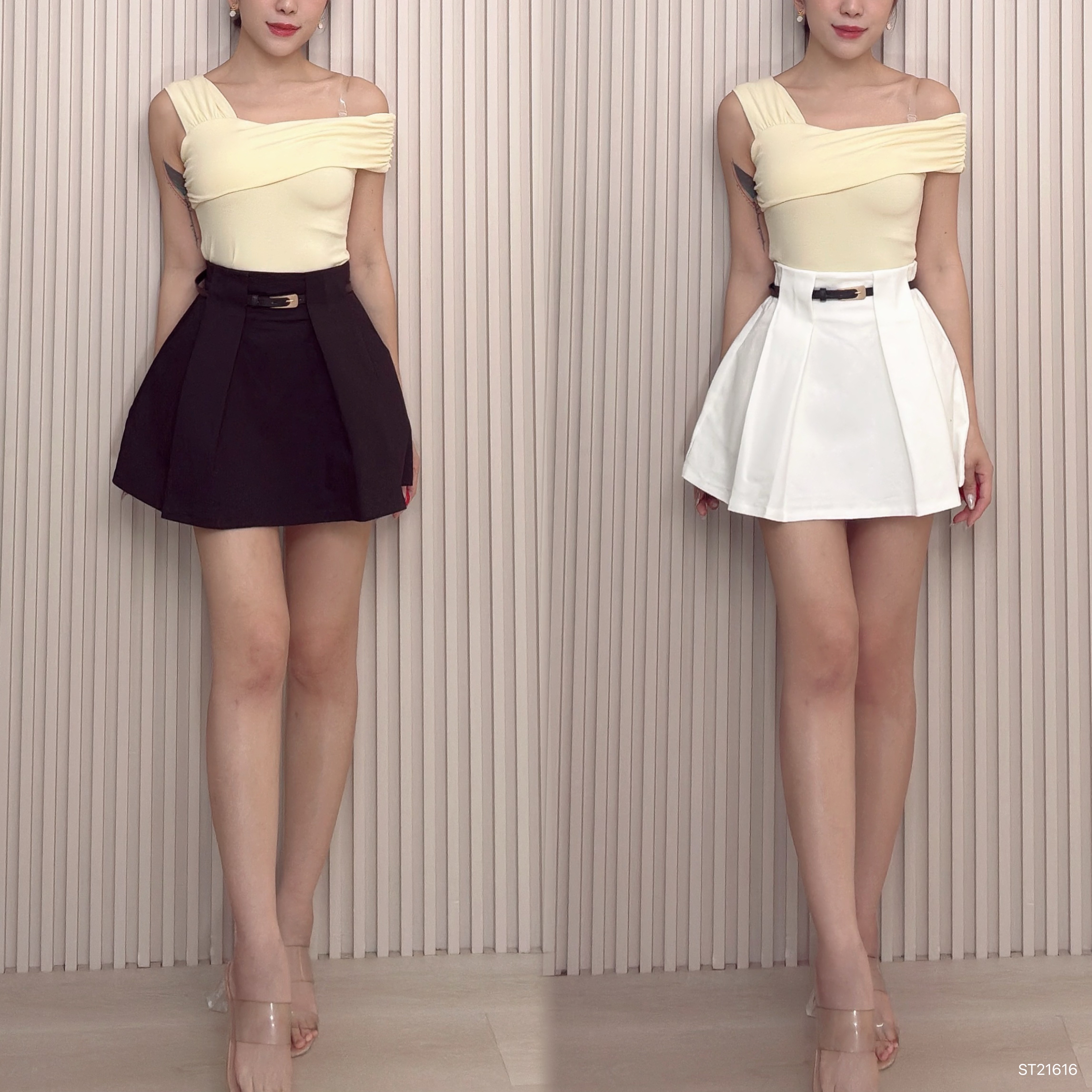 气质立体压褶设计A字高腰短裙 (ST21616)